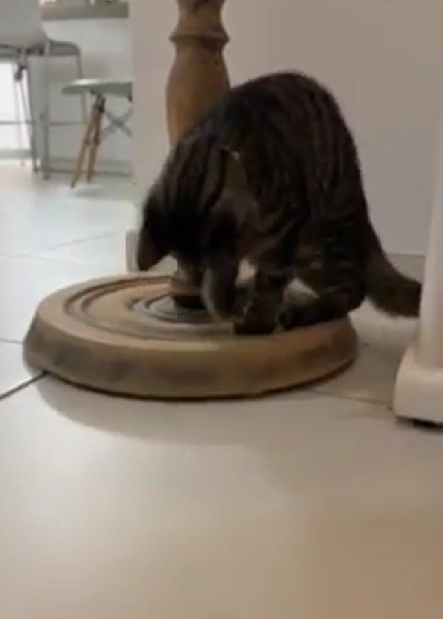 A tabby cat is eating from a small bowl atop a circular wooden platform on a light-colored tile floor