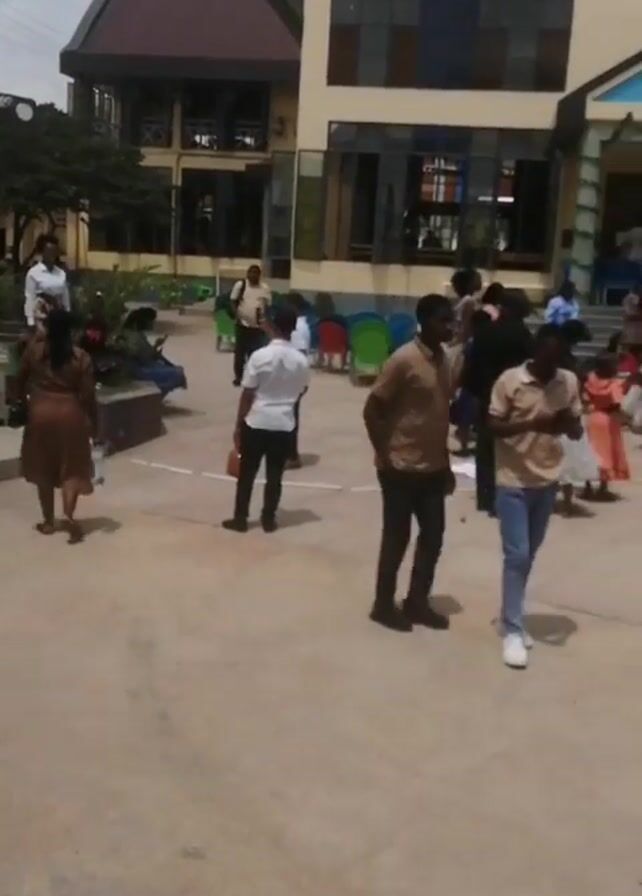 The video depicts a gathering of people in what appears to be the courtyard or entrance of a building, likely a church