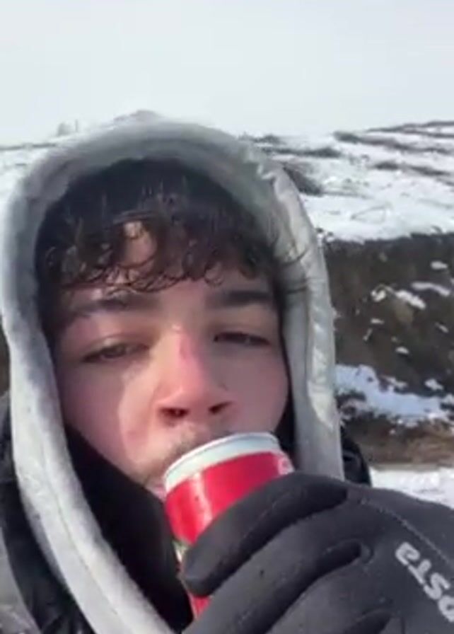 A person in a snowy landscape drinks from a red and silver can. The person wears a grey hoodie, a black jacket, and black gloves. They have curly hair and a bit of facial hair. The background shows a snowy hill with a road, a car parked on the side, and a rainbow in the sky. The weather appears cold and bright. The person takes a sip from the can and then looks around at the scenery.