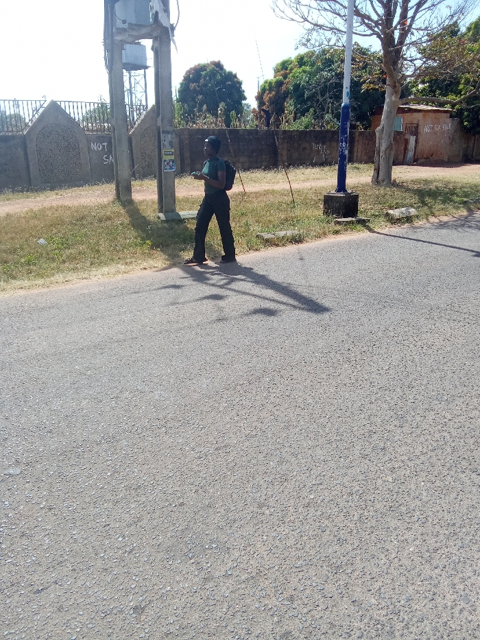 The scene depicts an outdoor environment in Bar Jirgi Summa, Nigeria, featuring an asphalt road, a grassy verge, and various structures under clear, bright daylight. In the mid-ground, a lone individual is visible, oriented towards the left. The individual is an adult, wearing a dark green short-sleeved top, dark trousers, and dark footwear. A dark backpack is worn on their back. They are holding a small, light-colored object in their hands, appearing to interact with it while standing on the grassy verge adjacent to the asphalt road. To the left of the individual stands a light-colored concrete utility pole with a grey transformer box mounted near the top and a poster affixed to its lower section. Behind this pole, a decorative wall with pointed top features and text appearing to read "NOT SA" is visible. Further back, a metallic water tank or tower is partially obscured. To the right of the individual, a second, thinner utility pole is present, painted blue and white near its base. Adjacent to this pole is a tree with bare branches. In the background, a continuous, weathered concrete wall extends, separating the grassy area from dense green foliage. To the far right, a small, rustic, light-brown building with a dark opening is visible, bearing painted text that appears to read "NOT FOR SALE." Long, dark shadows are cast across the asphalt road from the utility poles and the individual, indicating strong sunlight from an elevated position. The asphalt road surface in the foreground shows small aggregate detail. The grassy verge exhibits sparse, dry vegetation.