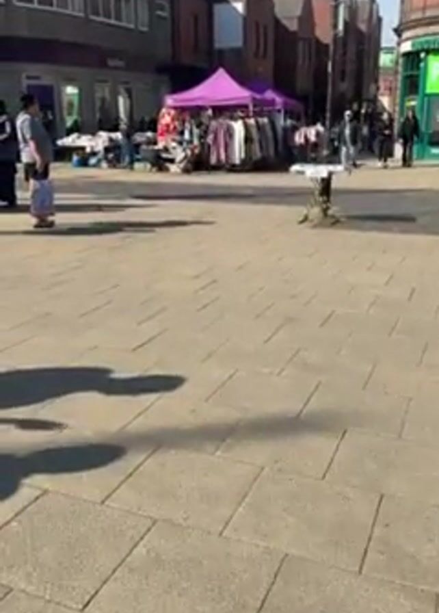 n outdoor flea market in a town square on a sunny day. There are several tents with vendors selling clothes and other items. People are walking around and browsing the merchandise. The ground is paved with light grey bricks. There are buildings on either side of the square.