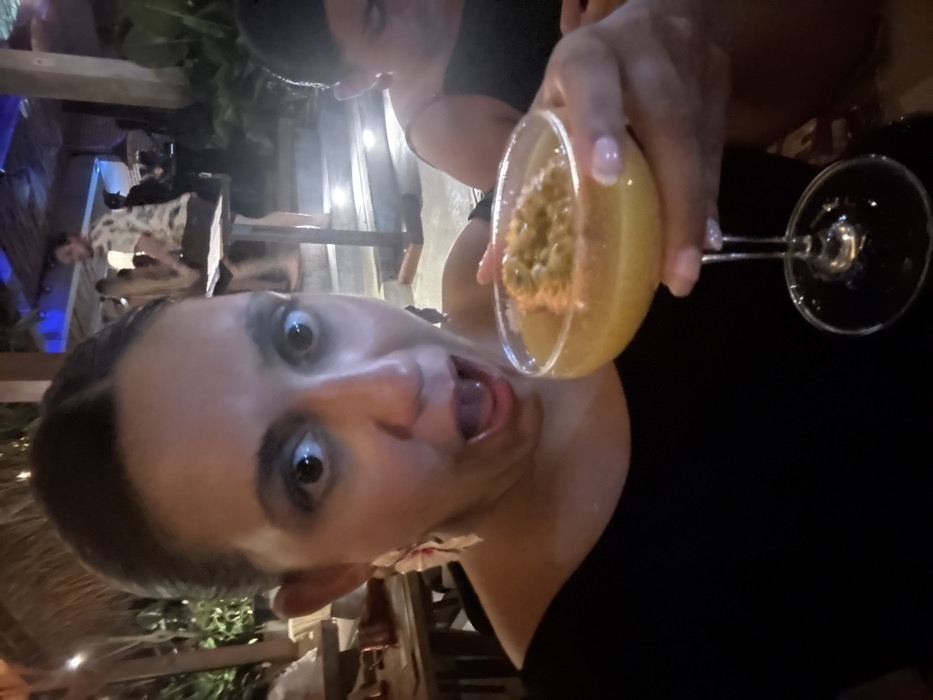 This image depicts a nighttime scene at a bar or restaurant in Uluwatu, Indonesia. The primary subject is a light-skinned female in the foreground, positioned centrally, looking directly at the camera with wide eyes and an open mouth, conveying surprise or excitement. Her dark hair is pulled back, and she wears a black off-the-shoulder top along with large, light-colored, possibly floral-shaped earrings. Her right hand, with light-polished nails, holds a stemmed coupe glass filled with a yellow-orange cocktail, generously topped with passion fruit seeds and pulp. In the mid-ground, to the right and slightly behind the primary subject, another blurred female figure is partially visible, wearing a dark top and looking downwards. Further in the background, a male figure wearing a light-colored, patterned short-sleeved shirt stands on illuminated concrete steps, facing away from the camera. Several other indistinct figures are visible throughout the background, suggesting a populated establishment. The environment features a rustic, possibly tropical design with visible thatch roofing, wooden structures, and lush green foliage. Artificial lighting, including string lights, integrated step lighting, and distant blue accent lighting, illuminates the scene. A tall, dark stand or high table with a paper or menu on top is visible near the illuminated steps.