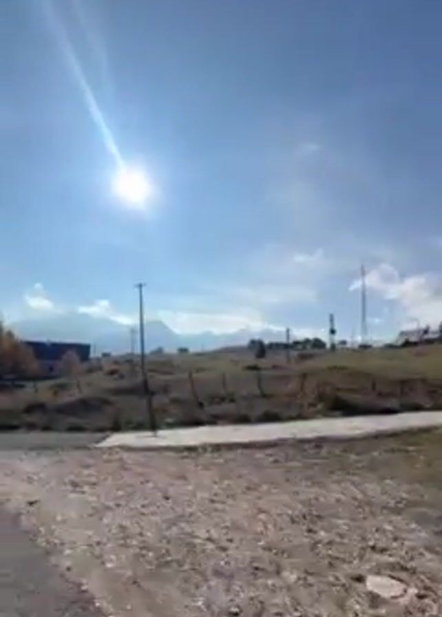 rural landscape under a clear, bright sky with the sun shining. The camera is likely moving, possibly from a vehicle driving along a road. To the right of the frame, there is a small building with a partially visible roof. A dirt road or path runs along the left side of the frame. Beyond the road, there is a grassy field with a fence running through it. In the background, there are several houses or buildings scattered across the landscape, as well as utility poles. In the far distance, mountains are visible on the horizon. The video appears to be taken during the day, possibly in autumn based on the colors of the trees.