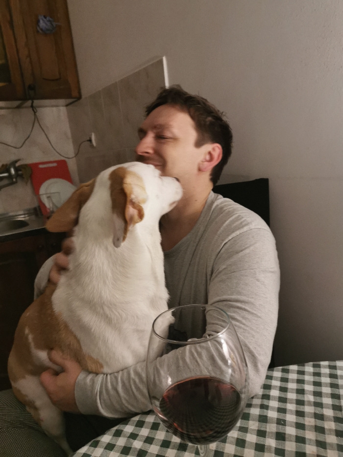 A man in a grey long-sleeved shirt is embraced by a white and brown dog. The dog's head rests near the man's face. The man smiles slightly. A glass of red wine sits on a checkered tablecloth in the foreground. A sink, wooden cabinets, and a cutting board are visible in the background.