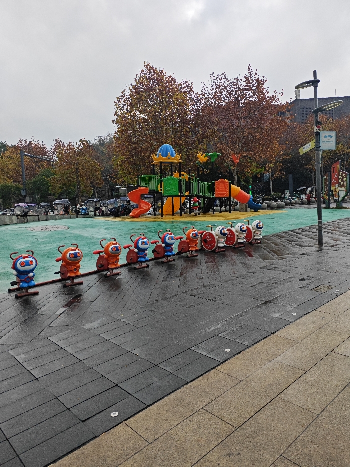 A playground under an overcast sky features colorful play equipment, including a slide, climbing structure, and spring riders shaped like robots. The ground is a mix of green padding and paved areas. Trees with autumn foliage surround the playground. A street lamp with signs stands nearby. The ground appears wet, suggesting it recently rained.