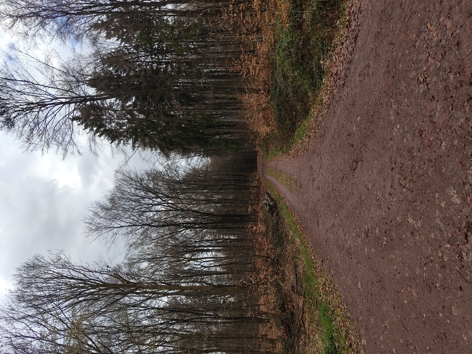 The image depicts a woodland path located near Mettlach, Germany. The path, composed of compacted brown soil, extends into the distance, bordered by trees on both sides. Most of the trees are bare, suggesting a late autumn or winter setting. The sky is overcast with a cloudy gray cover. No people or animals are visible in the photograph. The environment appears peaceful and isolated.