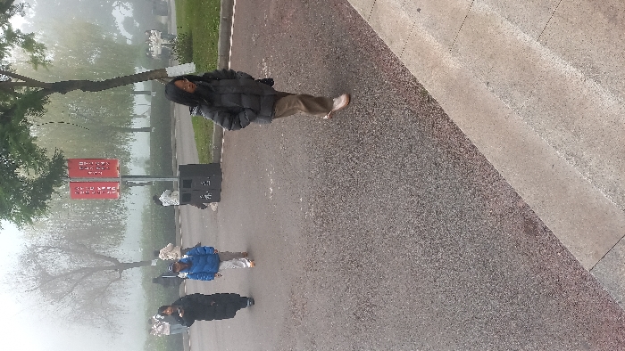 A partly cloudy outdoor scene shows four people walking on a road. To the left, trees line the road, and a red sign is mounted on a pole. Fog is present, obscuring the background. The road surface is dark and leads to a light-colored concrete structure on the right side of the image. The person closest to the camera wears a black coat and is followed by a person in a blue jacket. The next person is wearing a grey jacket.