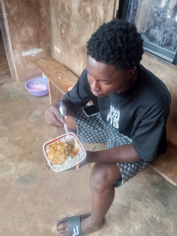 A young adult male with dark skin and short, curly black hair is seated indoors, eating
