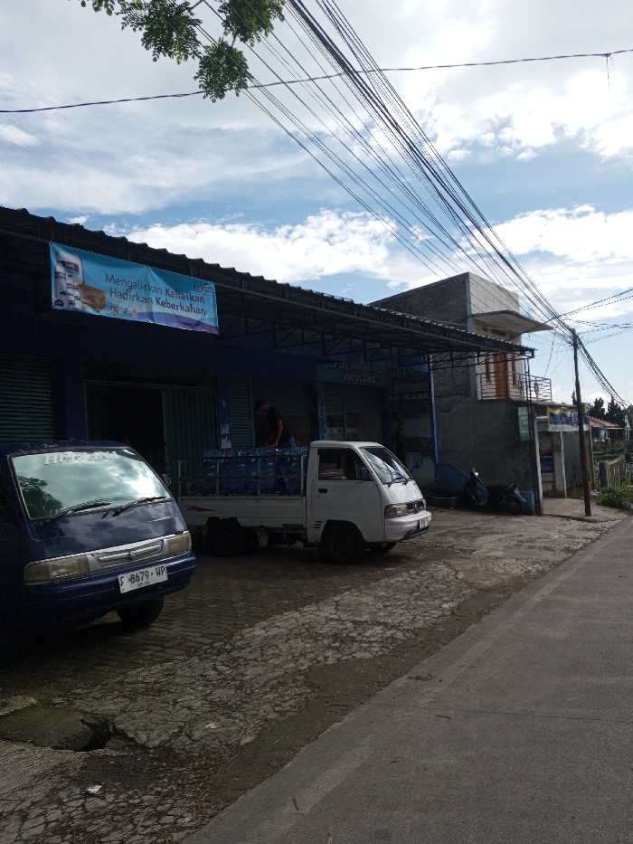 The image displays an outdoor commercial scene under a partially cloudy sky with numerous overhead utility wires. On the left, a single-story blue building functions as a "DEPOT AIR MINUM ISI ULANG" (Refill Drinking Water Depot), indicated by a sign on its facade. A banner above the entrance, in Indonesian, reads "Mengalirkan Kebaikan Hadirkan Keberkahan." Two vehicles are parked in front of this establishment. A dark blue van with an Indonesian license plate "F 8679 WP" is positioned on the left. To its right, a white pickup truck has its cargo bed filled with multiple large, blue plastic water bottles. A male individual, wearing a dark shirt, is observed in the bed of the pickup truck, handling the water bottles. Adjacent to the depot on the right stands a two-story concrete building featuring a small balcony on its upper level. A dark-colored scooter or motorcycle is parked near this building. The ground comprises a broken concrete or paved area directly in front of the buildings, transitioning to a dark asphalt road on the far right. Green foliage is visible in the upper left corner of the frame. Based on the Indonesian text on the signs and the Indonesian license plate format, the scene is located in Indonesia.