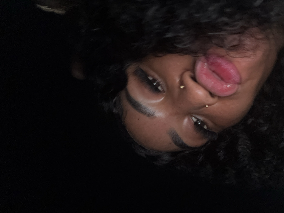A close-up, angled selfie features a dark-skinned person with curly black hair. Their tongue is extended, reaching towards their nose, which is adorned with two gold studs. The person has well-defined eyebrows and long eyelashes. The background is dark and out of focus. The lighting emphasizes the face and creates a stark contrast with the darkness surrounding it.
