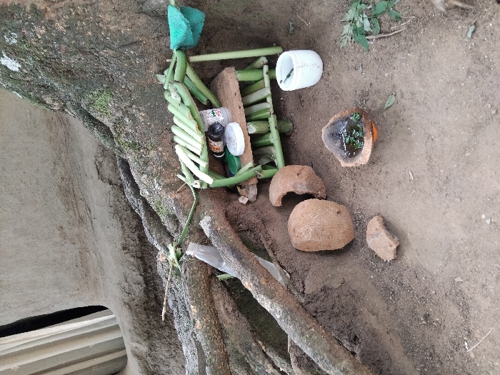 An assortment of items rests in a natural setting near a tree. Stacked green stalks form a frame-like structure adorned with bottles and objects. A white container and a broken coconut shell holding liquid and greenery are on the ground. Coconut shell pieces scattered around. A tree trunk and branches are present in the background, partially obscuring a concrete structure. The overall scene suggests a ritualistic or offertory arrangement.
