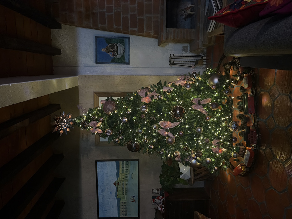 - "A Christmas tree adorned with lights, ornaments, and ribbons stands near a staircase" by FM-77Mox2, licensed under CC BY 4.0