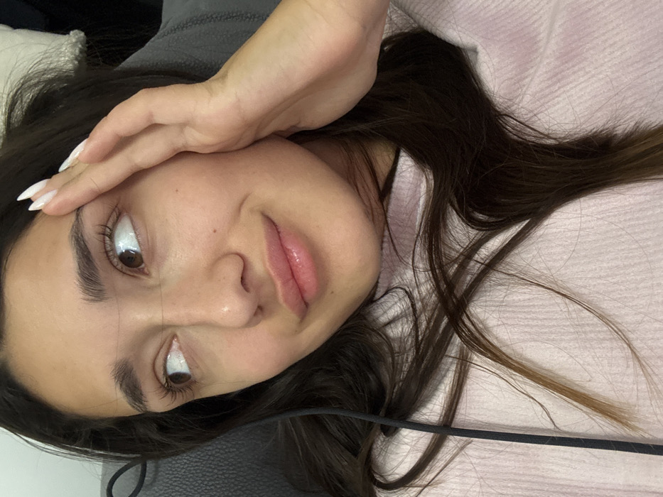 The scene depicts a female subject in an indoor setting, reportedly in the city of Budva, Montenegro. The subject, with fair skin, dark brown hair, and brown eyes, is captured in a close-up, gazing upwards and to her right, off-camera. Her lips are full with a glossy finish, and a slight, closed-mouth smile is present. Her right hand, displaying long, white, pointed fingernails, is positioned with fingers spread against her right temple and forehead. She is attired in a light pink, textured garment. A dark cable is visible vertically along the left side of her torso. The background is out of focus, showing dark grey upholstery behind her and a lighter grey surface to her left.