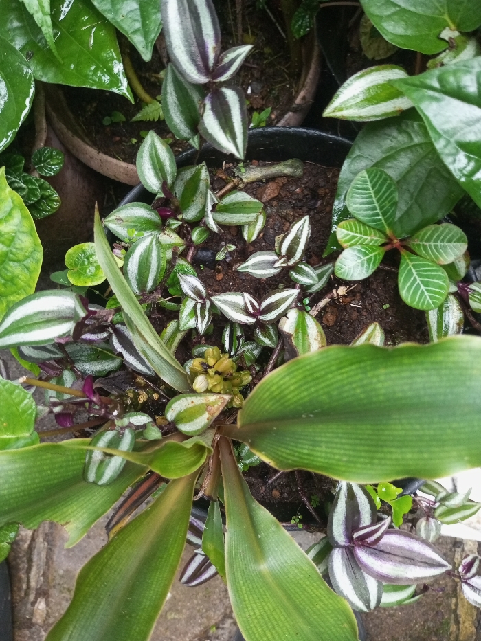 The image displays a close-up, top-down view of various potted plants in an outdoor setting, located in Pandaria, India. The primary subjects are several foliage plants, including multiple `Tradescantia zebrina` (Wandering Jew) plants with distinctive green, silver-striped, and purple-undersided leaves. A large-leaved plant with prominent parallel venation and a central cluster of small, yellow-green flower buds occupies the lower center. Additional green leafy plants, some with glossy surfaces and others with distinct venation patterns, are visible throughout the composition. The plants are contained within dark-colored and terracotta-toned pots filled with dark soil, situated on a light-colored concrete or stone surface. The leaves of the plants appear moist. No human subjects, actions, or interactions are present in the scene.