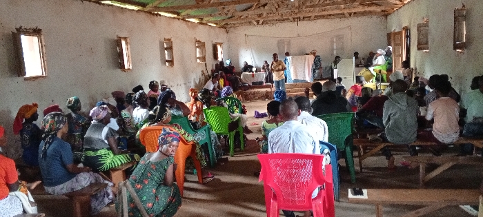 The image captures an indoor gathering within a large room located in Konongo, Democratic Republic of the Congo