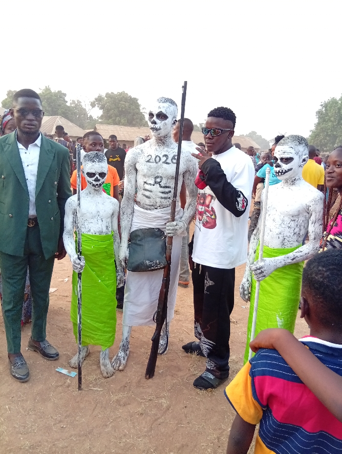 The image depicts a daytime outdoor gathering in the city of Andaha, Nigeria, on a reddish-brown dirt ground with sparse vegetation. Six individuals are prominent in the foreground. From left to right: A dark-skinned male in a dark green suit, white shirt, and glasses stands, looking directly forward. Adjacent to him is a child painted entirely white with black skull-like facial markings, wearing a bright green waist wrap, holding a dark stick vertically, and barefoot. Next is a taller male, also painted entirely white with black skull-like facial markings; "2026" is written in black on his chest above a rudimentary ribcage outline. He wears a white waist wrap, has a dark shoulder bag across his body, holds an old-model rifle vertically, and is barefoot. Next to him is a dark-skinned male wearing a white graphic t-shirt, black patterned trousers, sunglasses, and black slide sandals; his right hand is raised to his chin area. To his right, partially visible, is another child painted white with skull-like facial markings, wearing a bright green waist wrap and holding a light-colored stick. Further right, a partial view of a smiling female face is visible. In the immediate foreground, with his back to the camera, a child in a striped shirt (yellow, red, blue) has an arm partially extended towards the painted child on the right. The background shows a blurred crowd of people and indistinct structures under a hazy sky.