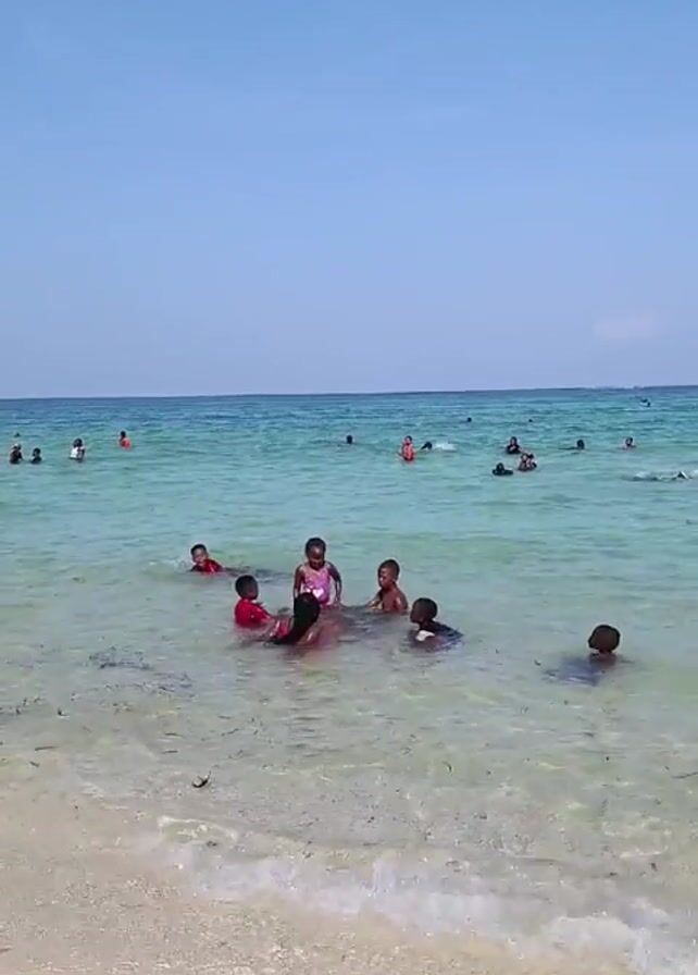 beach on a clear, sunny day. Several children are playing in the shallow, turquoise water near the shore. Other people, including adults and children, are swimming further out. The beach is sandy and the water is clear enough to see the sandy bottom. The overall atmosphere seems relaxed and joyful.
