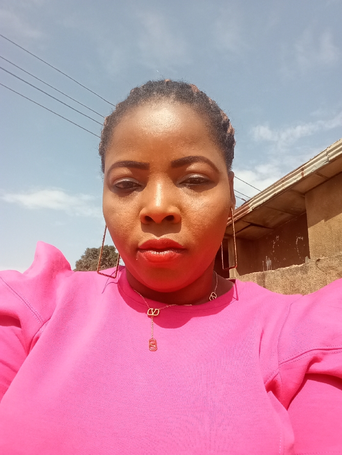 The image depicts a close-up, outdoor shot of an adult female in Sabon Tasha, Nigeria