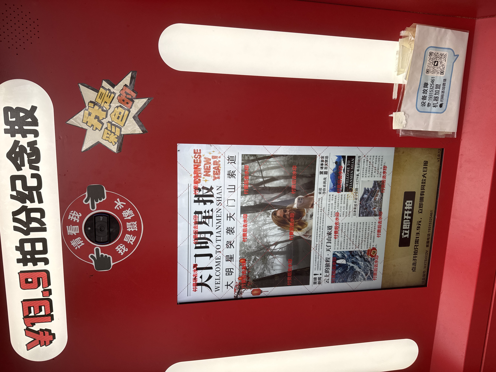 This image depicts a red automated kiosk or interactive display, located in Yongding District, China, designed to create personalized "commemorative newspapers." At the top, a prominent white oval banner displays "¥13.9 拍份纪念报" (Take a commemorative newspaper for ¥13.9). Below this, a circular decal features a Logitech webcam at its center, encircled by two pointing hands and the Chinese text "请看我 我是摄像头" (Please look at me, I am the camera). To the right, a star-shaped sticker with yellow text reads "我是彩色的" (I am colorful). The central display screen simulates a newspaper layout. The main title is "天门明星报" (Tianmen Star Newspaper), accompanied by "WELCOME TO TIANMEN SHAN" and "WELCOME TO CHINESE NEW YEAR!" banners. The primary visual is a photograph of a smiling Caucasian woman with blonde hair, wearing a white hoodie, positioned in a misty forest environment with subtle red lanterns. This image, along with several smaller images of mountain landscapes and traditional Chinese architecture, is conspicuously watermarked multiple times with "付费后去水印" (Remove watermark after payment). Chinese text describes attractions such as the Tianmen Mountain Cableway. At the bottom of the screen, a large virtual button displays "立即开拍" (Start shooting immediately), with text confirming the ¥13.9 price and stating, "Click to start shooting for only ¥13.9, immediately own the same big newspaper." The screen also shows "设备编号: W4B4XDV" and "客服电话: 19315325461 v1.0.12". To the lower right, a white paper note is taped to the machine. It reads "设备故障" (Equipment malfunction) and provides the customer service phone number "19315325461," along with "机器加盟" (Machine Franchise) and a QR code instructing "扫码添加微信" (Scan code to add WeChat). The kiosk's exterior is uniformly red, suggesting a commercial or tourist-oriented installation.