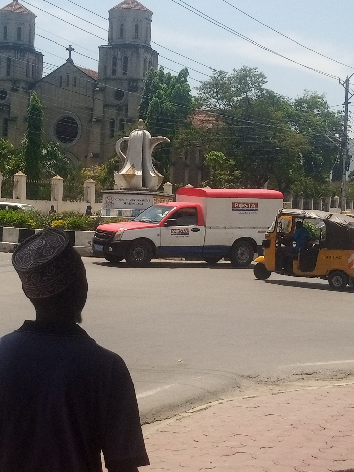 The image depicts a daytime street scene in Mombasa, Kenya, specifically at the Makadara/Mji Wa Kale ward near the Mkomani Roundabout. In the foreground, the back of an individual wearing a dark shirt and a patterned kufi cap is visible, facing away from the camera and towards the street. The midground features an asphalt road. A red and white Kenya Posta pickup truck with an enclosed cargo bed, marked "POSTA Tracking Lines," is positioned on the left side of the road. To its right, a yellow auto-rickshaw (tuk-tuk) with a black canopy, displaying "TAXI 5 PASS," is also on the road. A person in a blue shirt is visible inside the tuk-tuk, presumably the driver. The road is bordered by a raised curb and a reddish-brown patterned sidewalk on the right. In the background, a large, white monument shaped like a traditional Arabic coffee pot (dallah) stands on a circular pedestal. The pedestal bears partially visible text, "COUNTY GOVERNMENT OF MOMBASA." Behind this monument, a grand, light-colored stone church, identified as the Holy Ghost Cathedral, dominates the skyline with its two prominent bell towers, conical roofs, and a central cross. A large circular window is visible on the church's facade. Green trees are interspersed throughout the background, partially obscuring parts of the church and surrounding area. Overhead utility lines are visible against the clear sky.