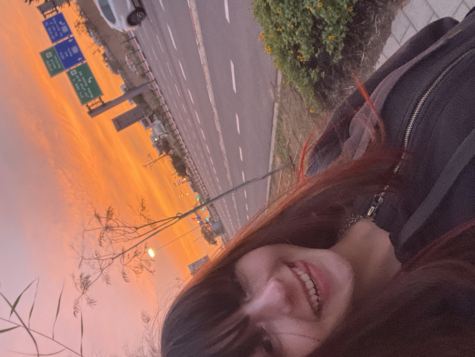 A woman smiles, facing the camera. The sky is a gradient of orange and pink, indicating sunset or sunrise. A highway runs parallel to the sky, with a white car visible in the distance. Road signs are on the left. A bush with yellow flowers lines the edge of the road on the right. The woman is wearing a dark jacket. The picture is angled.