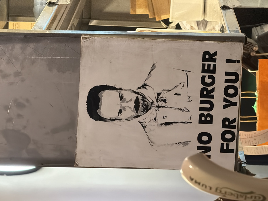 The image displays a white rectangular sign with a black and white stencil-style illustration of a man with dark hair, a mustache, and a goatee, wearing a collared shirt with a bow tie, looking sternly directly at the viewer. Below the illustration, in bold black capital letters, the text reads: "NO BURGER FOR YOU!". The sign is affixed to a scuffed, vertical metallic surface. To the left, a cream-colored tap handle with "Carlsberg LUMA" inscribed is partially visible. To the right, a metallic shelf or counter holds stacked cardboard boxes and a white plastic container. Below the sign, paper receipts are hanging against an orange surface. The scene depicts a commercial kitchen or serving area within a food establishment in Tel Aviv, Israel, specifically identifiable as a branch of The Brothers Burger (Ha'achim Burger), known for this distinctive Seinfeld-inspired signage.