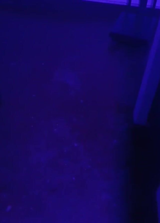 small, white dog standing on a dark, possibly purple, floor. The dog looks up at the camera. There is a white table leg to the right and a blurry, dark object in the background. The lighting is predominantly blue, giving the entire scene a monochromatic cast. There's the sound of a man speaking in the background.