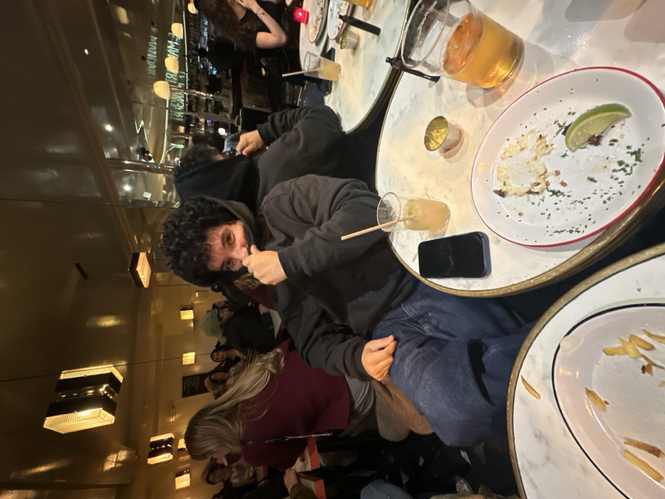 The image depicts the interior of Le Mary Stuart, a restaurant and bar located at 12 Rue du Mont Thabor, 75001 Paris, France. The environment is dimly lit with warm light emanating from square and rectangular overhead fixtures. In the foreground, a person with dark, curly hair, wearing a dark hooded sweatshirt with the hood up and blue jeans, sits at a white marble-topped table with gold-colored edges. The individual is looking towards the camera, smiling, with their right hand pulling the collar of their hoodie towards their mouth. On the table directly in front of them, a tall glass with a light-colored beverage and a straw, a black smartphone, a small metal ramekin containing a yellowish substance, and an oval white plate with a red rim displaying food remnants and a lime wedge are visible. A portion of another white marble-topped table is visible on the far left, featuring an oval white plate with fry remnants. To the right, another glass holds an amber-colored liquid. In the mid-ground, a large mirror reflects a second individual, whose back is to the camera, wearing a dark hooded sweatshirt with the hood up. This mirror also displays inverted text, partially legible as "STU" and "MANDINAW" (reflecting "WANDINAM"). The background features multiple other patrons seated at tables. A woman with long blonde hair, wearing a maroon top, is visible on the left, facing away from the camera. The overall scene indicates an active dining or socializing environment.