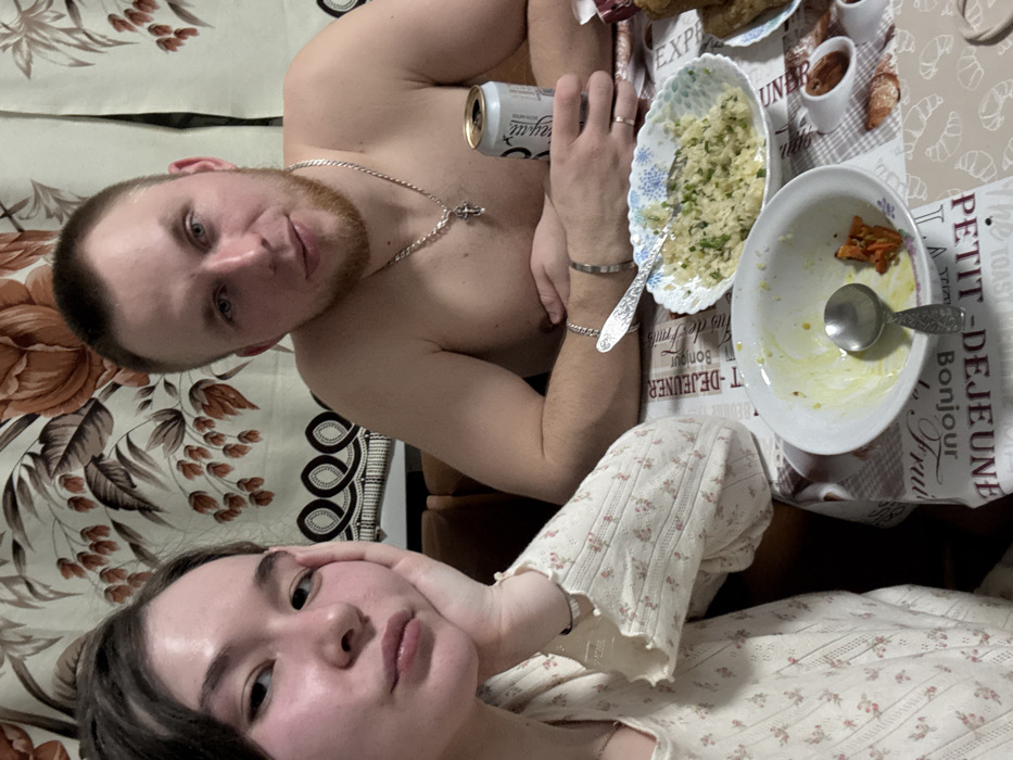 A selfie captures a couple seemingly reclining after a meal