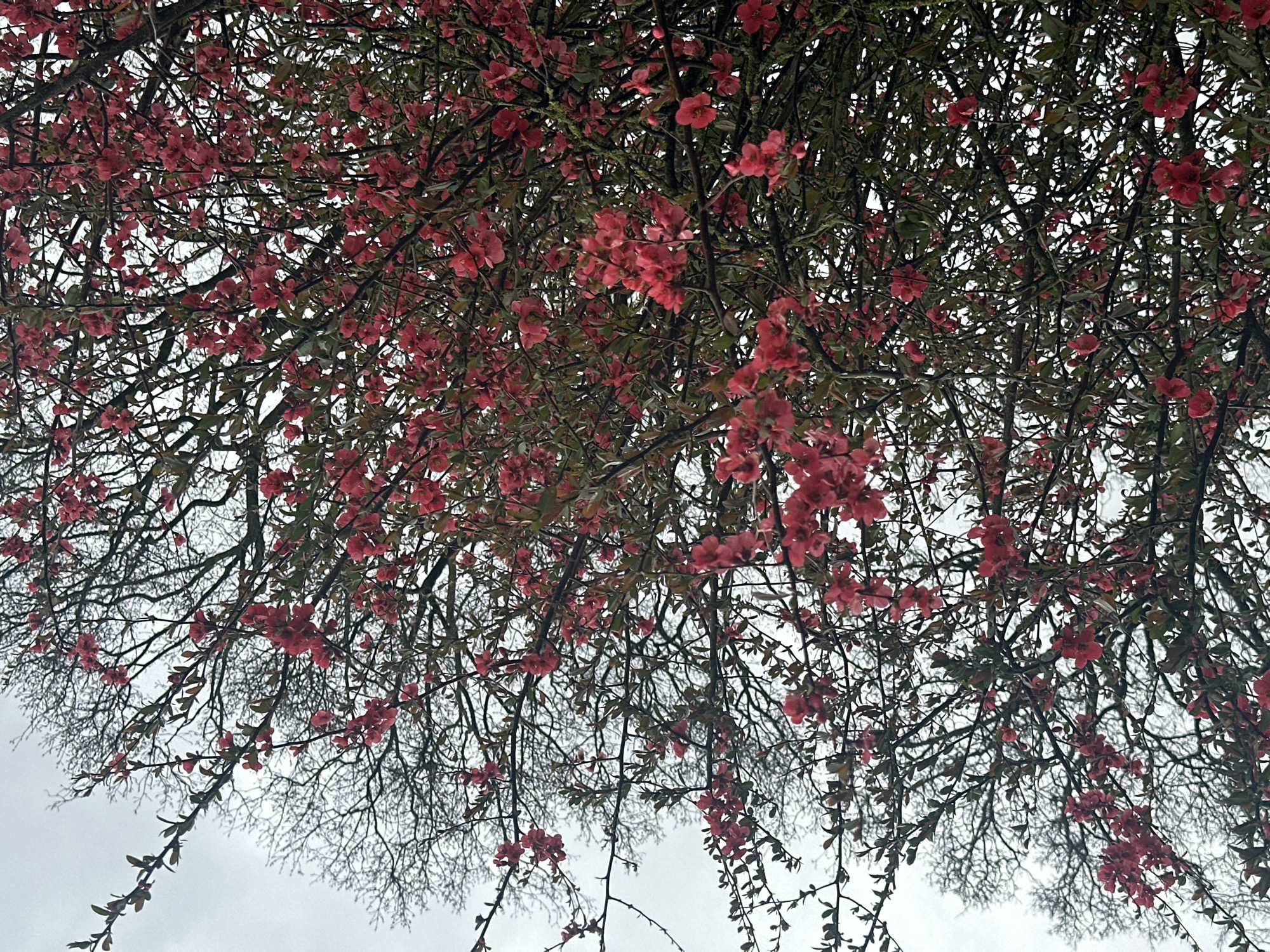 The image displays a close-up, upward-angled view of a flowering tree against an overcast sky in Sint Anthonis, Netherlands. Numerous clusters of deep red, five-petaled blossoms, approximately 2-3 cm in diameter, are visible among small, dark green leaves on dark brown, textured branches. Some branches are partially covered with light green lichen or moss. In the background and interspersed with the flowering sections, a dense network of bare, skeletal tree branches, dark grey in color, is silhouetted against the uniformly pale grey sky. No individuals, animal life, or man-made objects are discernible within the frame.