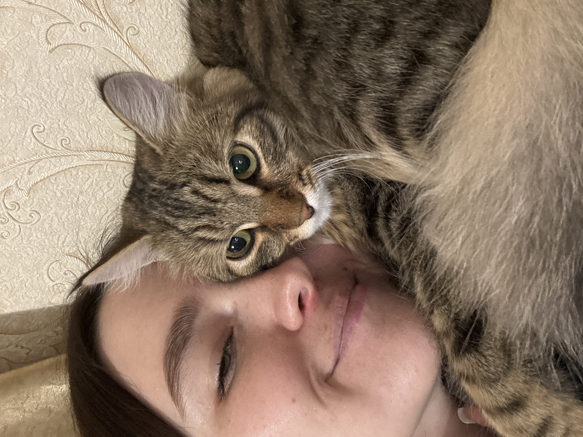 A woman is lying down with her eyes closed, a tabby cat is resting on her head. The woman's face is visible, with dark hair and light skin. The cat has green eyes and brown fur. The background is a beige patterned fabric, possibly a bedspread or blanket. There is no indication of the city of Chaikovsky, Russia, or any specific location information in the image.