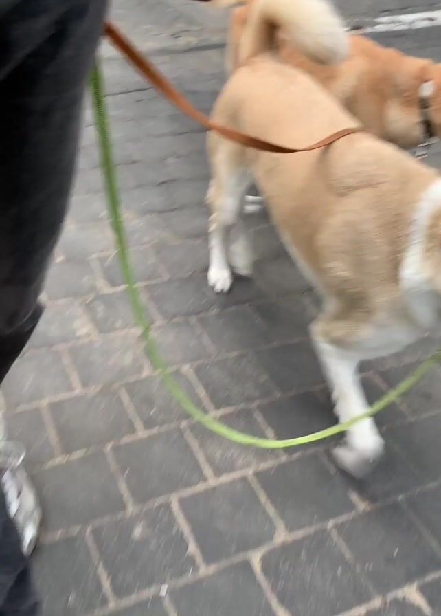 A person walks two dogs of different breeds on leashes on a sidewalk. The dogs are brown and tan. The person is wearing a denim jacket and gray pants. The sidewalk is made of gray paving stones. The location appears to be urban with white buildings nearby. Another set of two dogs of different breeds are seen walking, one white with pointed nose and one tan and white with shaggy fur.