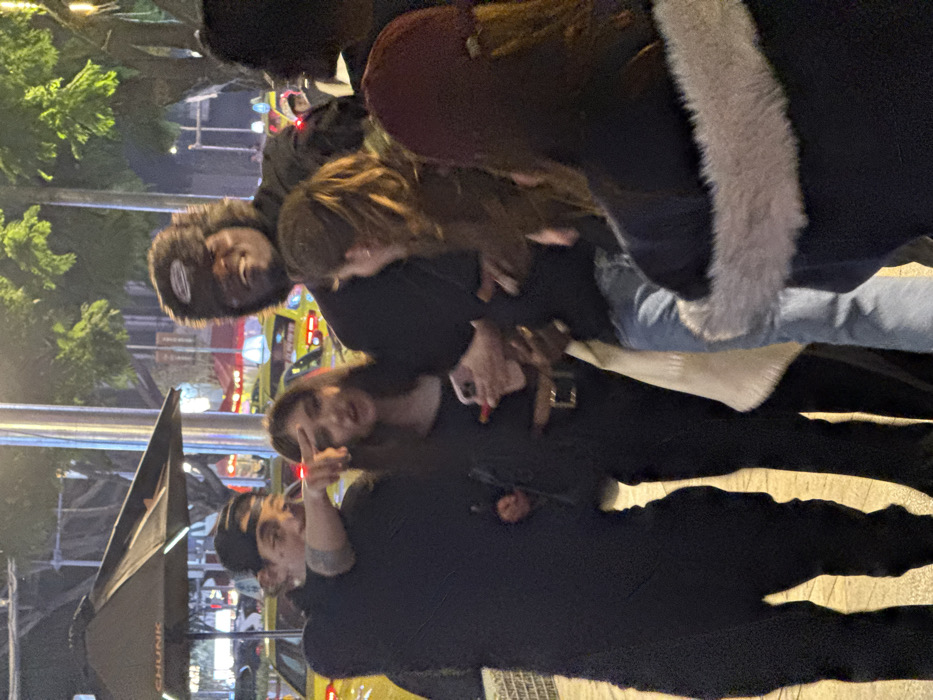 The image depicts an urban street scene at night, featuring a group of five individuals in the foreground
