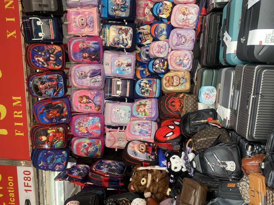 A merchandise display features various bags and suitcases. There are character-themed backpacks, including Spiderman, Frozen, and Captain America. The suitcases are mostly black, silver, and teal. There is a brown bear-shaped bag at the bottom of the display. The products are neatly stacked. A red sign with vertical lettering is seen on the left.