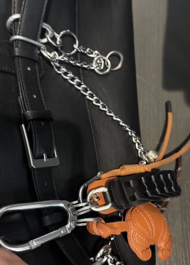 black bag being opened to reveal its contents. Inside are two loaves of bread in plastic packaging, one loaf of bread in paper and plastic packaging, and three cans of Red Bull energy drink. The bag appears to be inside a car. The bag has decorative silver chains and a leather keychain.