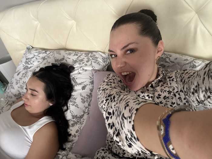 The image depicts two individuals in a bedroom setting located in Barrio de Nuevo León, Mexico. A bed with a cream-colored, tufted headboard and white and grey floral-patterned bedding fills the frame. On the right side of the image, one person, identified as female, with dark hair pulled back into a bun, is actively engaging with the camera. She wears a white and black floral-patterned long-sleeved top, a gold hoop earring on her visible right ear, and a gold-toned bracelet with blue and white beads on her left wrist. Her mouth is wide open, her eyebrows are furrowed, and her head is slightly tilted, conveying an exaggerated or playful expression. To the left of this individual, another person, also identified as female, with dark hair (some clips visible), lies on a floral-patterned pillow with her eyes closed, facing away from the camera. She is wearing a plain white tank top and appears to be sleeping or resting. A solid light purple pillow is positioned between the two individuals.