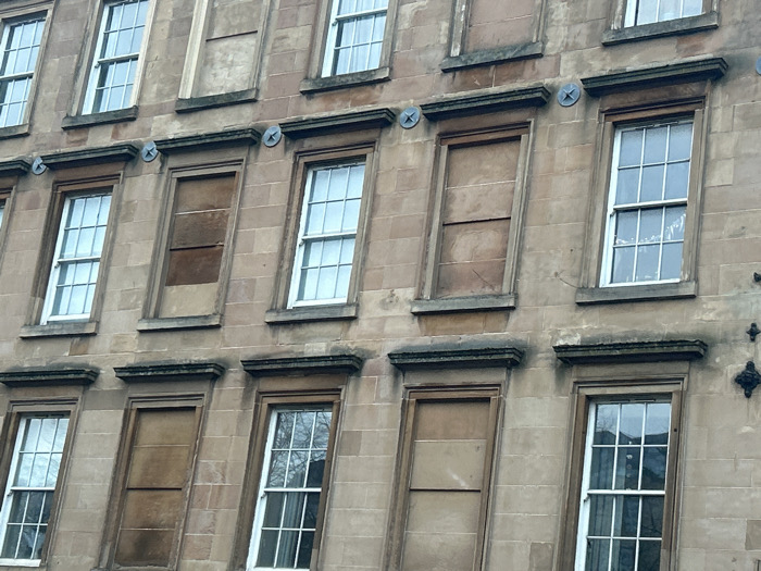 The facade of a stone building is captured, revealing a pattern of windows. Some windows are clear with white frames, reflecting the exterior, while others are boarded up with dark, solid panels. Decorative stone elements frame each window. Circular metal fasteners are visible above some windows, suggesting structural reinforcement. The stonework is aged and weathered, contributing to the building's character.