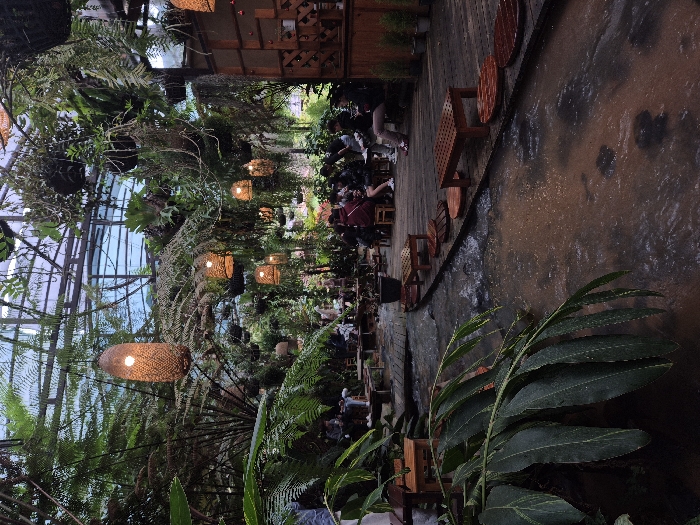 - "An indoor/outdoor restaurant features dense greenery, hanging woven light fixtures, and a partial glass ceiling" by FM-vOprn2, licensed under CC BY 4.0
