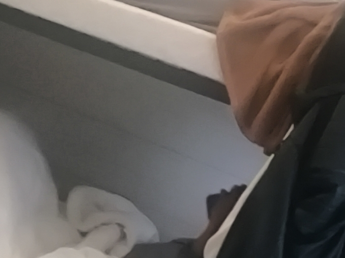 The image displays an indoor scene located in Dresden, Germany. A person with dark skin is depicted from a low-angle perspective, appearing to be lying down or reclining. The individual wears a dark upper garment with a distinct white vertical stripe. Above the person's head, a folded reddish-brown piece of fabric, possibly a blanket or clothing, is visible, partially draped over a white horizontal structure, which appears to be a bed frame or shelf. White bedding material is present on the lower left portion of the frame. The background consists of a plain grey surface, likely a wall or ceiling. No specific actions or interactions are discernible beyond the individual's posture of rest.