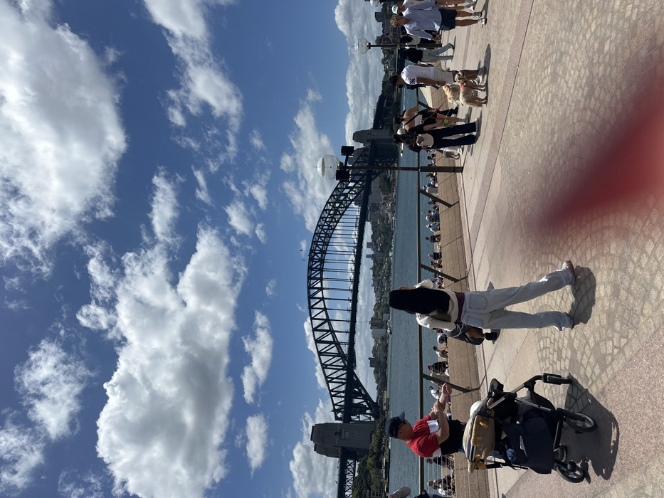 Sydney Harbour Bridge dominates the left side of the image, set against a partly cloudy blue sky. A wide promenade with numerous people runs along the right. Some are walking dogs, others are standing and looking at the view. A person in white pants and a black top is standing near the edge. A man in a red shirt and a child in a stroller are visible in the foreground. A reddish flare appears on the right side of the image.