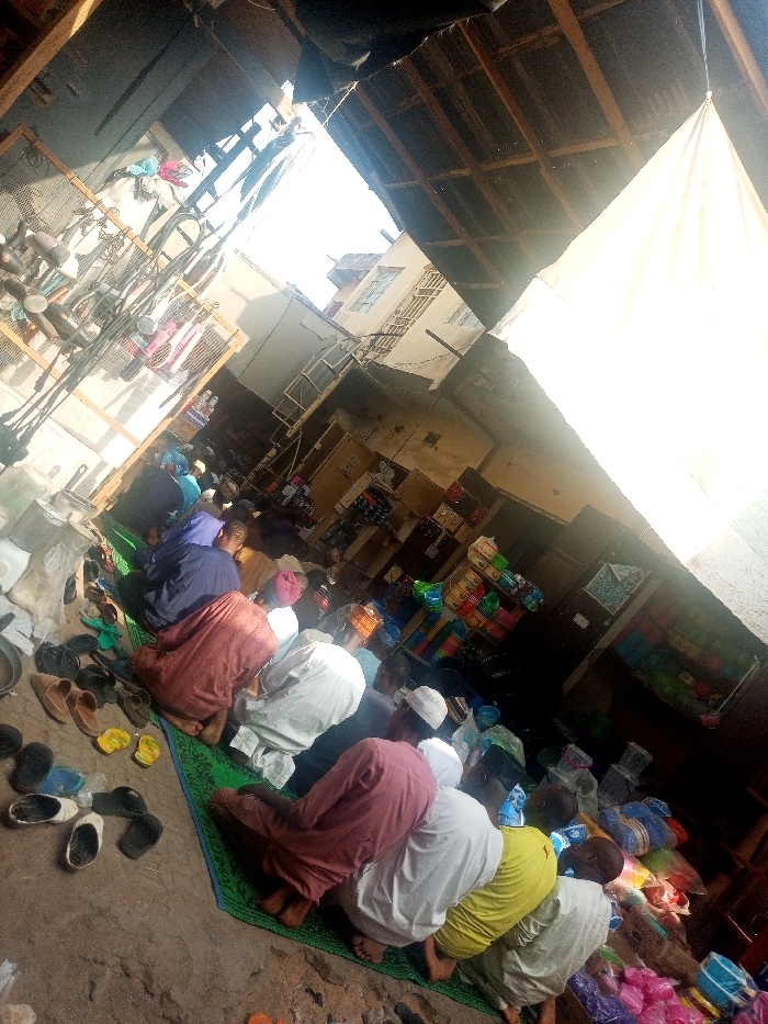 The scene, located in Arawa, Nigeria, depicts approximately ten to fifteen individuals performing Islamic prayer within what appears to be a semi-covered market or commercial area