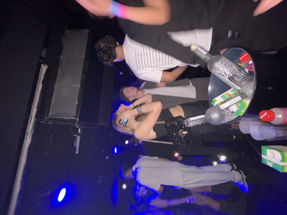 A dimly lit club scene with multiple people. A young woman in a black top holds a phone up to her face. Several people are standing or leaning around a small table laden with bottles, including a Belvedere vodka bottle in an ice bucket, and other drinks. The scene is lit with blue lighting, creating reflections on the shiny floor. Some people are wearing light-colored tops.