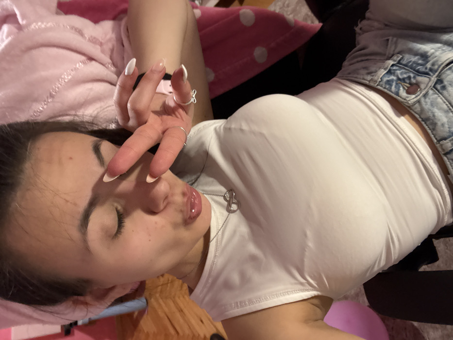 This indoor image depicts a young female located in Radomir, Bulgaria. She possesses dark hair and a light complexion, with her eyes closed and her lips distinctly pursed. She is dressed in a white, sleeveless, form-fitting top and light blue distressed denim jeans. A silver-colored chain necklace with an infinity symbol pendant is visible around her neck. Her left hand is raised towards her face, with the index and middle fingers extended in a 'V' gesture, partially obscuring her upper face. She wears a plain silver-colored ring on her left ring finger and a silver-colored bow-shaped ring on her right pinky finger. Her fingernails have white tips. The background on the immediate left shows a wooden floor, a partial light blue object, and a pink spherical object. On the right, a pink blanket or garment with white polka dots is draped over what appears to be a piece of furniture, resting on a light-colored, textured rug.