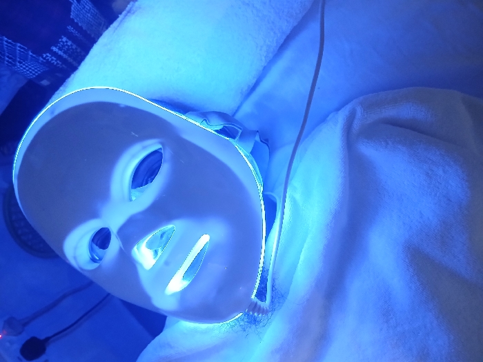 - "A person lies covered in a white towel or blanket with a glowing blue LED facial mask" by FM-zPBDx2, licensed under CC BY 4.0