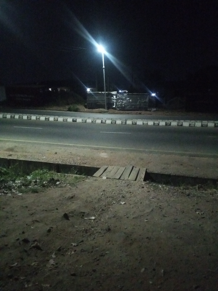 Night scene of a road illuminated by a street lamp. A concrete curb with alternating light and dark blocks runs along the road's edge. In the foreground, a dirt area leads to a shallow trench covered by planks. Dimly lit buildings and structures line the opposite side of the road, adding depth to the dark backdrop.