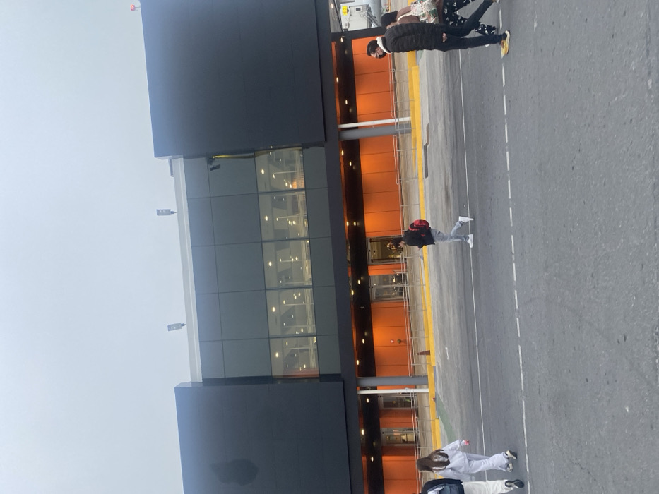The image depicts an exterior view of a modern airport terminal building, identified as Monterrey International Airport in Apodaca, Mexico, under an overcast sky. The multi-story structure features a dark gray upper facade with a horizontal band of multiple windows, revealing interior lighting. The lower level is characterized by bright orange walls set behind several glass entrance doors. Multiple light fixtures are visible along the building's roofline. In the foreground, an asphalt roadway is present, marked with white dashed lines indicating a pedestrian crossing or lane separation. A yellow curb line and metal railings run along the front of the building, with a single orange traffic cone positioned near the curb. Five individuals are observed walking across the scene. From left to right: two pedestrians in light-colored clothing walk away from the camera, one wearing a light gray tracksuit and holding a small red object. Centrally, a male subject wearing a dark jacket, light-colored pants, white sneakers, and a red backpack traverses the roadway from left to right. To his right, two additional individuals walk in the same direction: a male wearing a dark puffer jacket, dark pants, yellow-soled shoes, and a black face mask, alongside a female in patterned pants and a light top, carrying a shoulder bag. A jet bridge is partially visible on the far right, adjacent to the terminal building.
