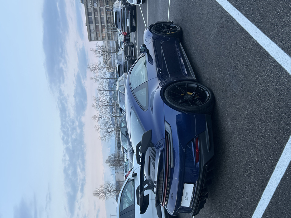 - "A dark blue Porsche 911 GT3, featuring a prominent rear wing, black multi-spoke wheels with yellow brake calipers, and a central twin-pipe exhaust system, is parked at an angle in an asphalt parking lot" by FM-Qs7N73, licensed under CC BY 4.0