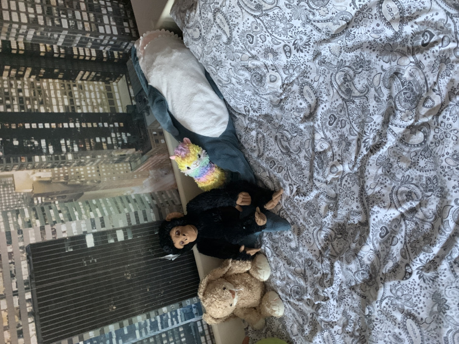 A bed with paisley-patterned bedding is covered with stuffed animals. A long, white, shark-shaped pillow lies along the edge. A colorful llama, a black monkey, and a tan teddy bear are clustered together. A green object is partially visible at the lower edge. A city-themed wallpaper is seen behind the bed.