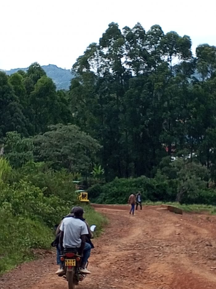 A dirt road meanders through lush greenery, with dense trees and shrubs framing the path. Two people walk along the road, while a motorcycle with two riders approaches the viewer. A yellow machine sits near the edge of the road, partially obscured by vegetation. In the background, a hazy mountain range peeks through the trees, suggesting a rural or mountainous setting. The sky is overcast.