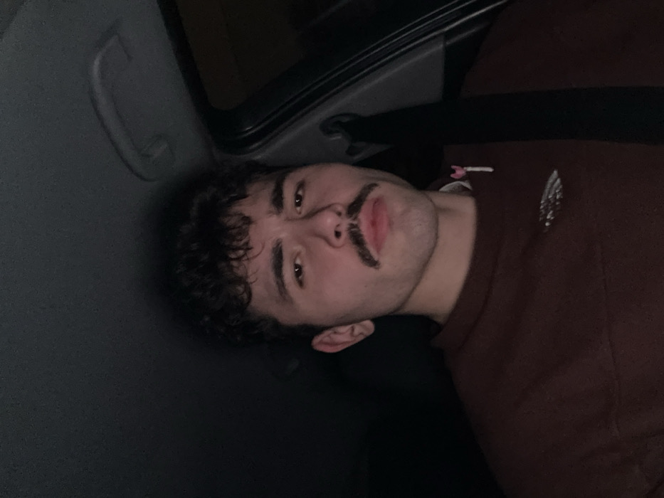 A person lies sideways in a car, wearing a brown sweater and seatbelt. The person has dark curly hair and a drawn-on mustache. The ceiling of the car and a handle are visible. The lighting is dark.